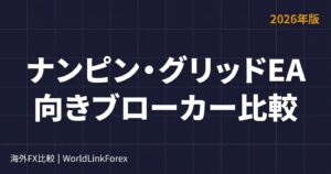 この記事では、国内掲載7社をナンピン・グリッドEAとの相性で分類し、特に相性の良いブローカーを詳しく解説します。EA全般の基礎知識についてはMT4でEAを動かすまでの手順【初心者向け2026年版】も合わせてご覧ください。